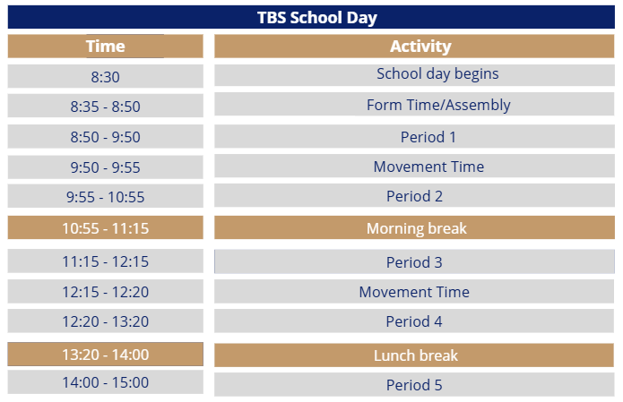Students in years 7 to 11 are expected to be in school from 8.30am and in form every day at 8.35am. Once a week, they are in an assembly which also starts at 8.35am.